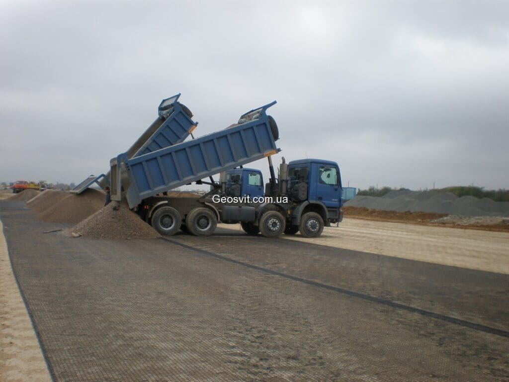Для запобігання пошкодженню геоґратки заборонено заїзд транспортних засобів та будівельної техніки безпосередньо на незахищене (не перекрите матеріалом засипки) полотно.
